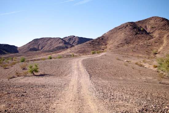 After an initial dip into a narrow wash, the start of the path looks fine, if a bit soft. The bike tire trail ahead is mine, from an earlier look-see.