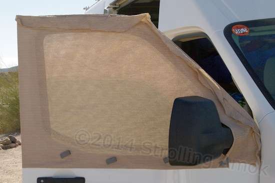 The first thing I noticed was the pair of unique screens slipped over each of the van’s front doors. Essentially window socks, they are slipped over the upper doors and allow the side windows to be cranked down while keeping both bugs and hot sun out. He told me that the material, available at Lowe’s and Home Depot down here, is specifically made as a shading material, sold by the linear foot from 6-foot and wider rolls. His fabrication includes a section that deals nicely with the side view mirrors, and it’s held tight with magnets.