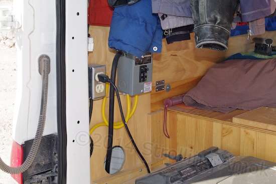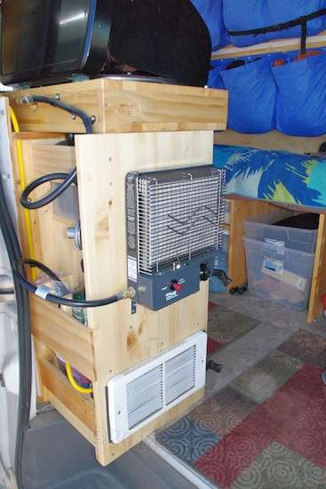choice of two here. The AC-power electric heater is for use when the van is at Richard's home base campground, while a propane ceramic heater does the job when boondocking.