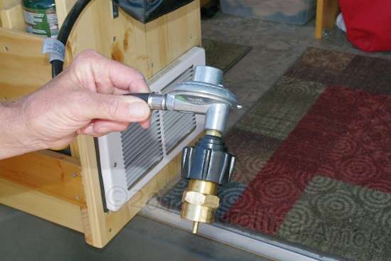 Richard has added an adapter to enable the Olympic heater to run off of more compact 1-pound propane bottles.