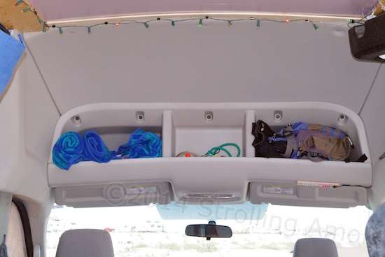 The driver’s side wall is festooned with 50-cent Walmart shopping bags, their logos discreetly turned against the wall. They replace a cargo net intended for a pickup truck bed, and the two black knobs still screwed into the plywood hint at the legacy. He told me, “I had it up here and put the clothes in it, but it kept stretching and stretching. I put the bags up and figured they wouldn’t hold up, but they’ve been there for 3 years.” And there is no hint of a problem with them, by the looks of it.