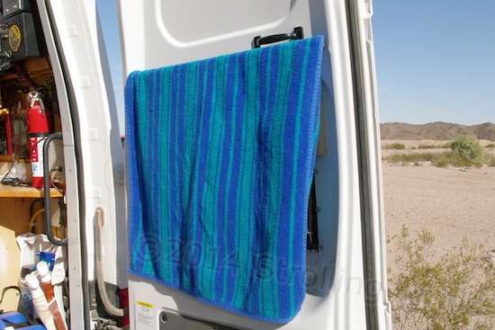 Richard’s take on the factory windows was poor. “They have factory windows that fit in here, but the way those windows work is that they were fixed and they were glued into this space, so you’ve got a window THIS BIG and an opening just that big.” The indent for a window in the door sheetmetal is a huge, swooping affair, while his indication of the actual opening size was puny. It simply wouldn’t do. But the thought of taking a saber saw to brand new, pristine body sheetmetal makes me queasy, with visions of the Animal House denizens butchering a perfect suicide-door Lincoln Continental with a power chisel and mallets. Richard was nonchalant. “With the sabre saw, what you do is tape everything up, mark it, and then you’re cutting on the tape so you don’t scratch the paint up. There was a strip down here that kept the outside panel from rattling. I broke the welds and got that out.” Mind you, I like the results – I just wouldn’t be able to watch the process. Too squeamish. I felt bad enough from carving a 3″ hole in the bottom of my pickup’s bed as a passthrough for the Tankmin’s drain hose, and nobody can see that. Richard topped off his windows with a rectangle of metalized Reflectix insulation, which is held by strips of Velcro so it can be mounted and removed at will. That eliminates the heat gain without affecting airflow or rain entry. He then mounted a curtain rod over the inside of each rear window to allow it to double as a curtain and towel drying rack.