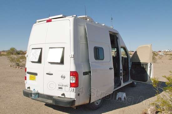 Also pretty good is Richard’s ample solar setup. Most people with vans use gutter-mount ladder racks, but that can be an issue with high-tops. The Nissan NV series comes to the rescue here, as the van virtually bristles with pre-threaded mounting brackets inside and out. That includes the roof, which even on the high-top is configured to accept a dealer-installed ladder rack. “They actually welded little brackets up there in that hidden rain gutter. I did use standard bolts. I was going to get stainless steel and said the heck with it. They haven’t rusted. There was a commercial ladder rack available for it, but they wanted $300-some dollars for it. And when I looked at it, I realized I’d have to build another rack on the rack to make the solar panels fit.”