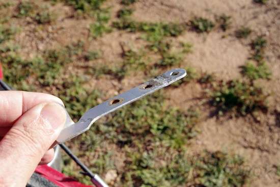 Bugger! I told you these trails are rocky and washboarded! The original fender support bracket snapped.