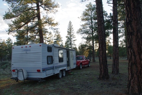 My spot in Tusayan on NF 302 was occupied by an even older duffer in a fifth-wheel who had a campfire going at 5 in the afternoon, and it was about 73 degrees out. Okaaay. I broke out the Avenza Motor Vehicle Usage Maps for the Kaibab Tusayan area on the ancient iPad, and headed west into unfamiliar territory. It was well after 5 PM by this time, and I took a trail to Tusayan’s power station and parked on the gravel. I broke out the Evelo e-bike from the front of the Mighty Furd, since the trails were rough and closed in, which is not the best thing to drag the trailer into without some foreknowledge. Though not all that far from the highway, this is fairly close to primordial forest in general feeling. I didn’t go all that far along a few trail branches. Two looked hopeless for the Defiant, and one looked pretty good, as long as the weather doesn’t turn wet. I located a spot which is at the intersection of two trails, so it’s not secluded but will do fine if nothing else can be located tomorrow on the bike. I’m staying in Transport Mode (no solar panels) for now, until I can either locate a better spot or fail miserably and stay put to deploy them.