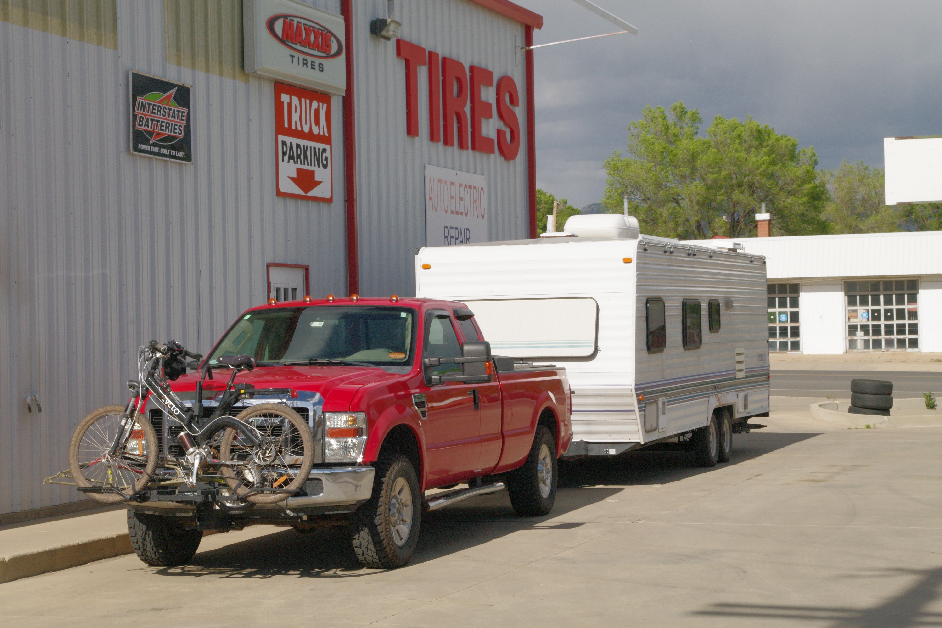 Well, the inevitable happened. I was going to post about what I saw at the Overland expo next and ignore the return trip, but here you go. Travelling up I-25 north of Santa Fe, New Mexico, I stopped at a rest area to hit the potty and check the Defiant’s wheel bearing and tire temperatures. Everything was stellar. Not ten miles farther on, I felt some weirdly bumpy pavement and while I was wondering what the deal was, I looked in the rear view mirror and saw that the trailer was no longer level side to side. Glancing out the right side mirror, bits of tire debris were spewing out of the trailer’s wheel well. That’s rarely good.