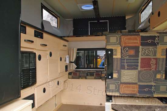 Two seats facing a suspended table, with just enough space for a small Porta Pottie under that shelf. Pull-out double bed is over the truck cab.