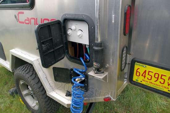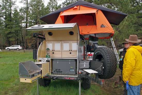 The rear of the same rig offers an awning over a counter, stove, grill, and sink. And it can handle rougher ground than the vehicle towing it.