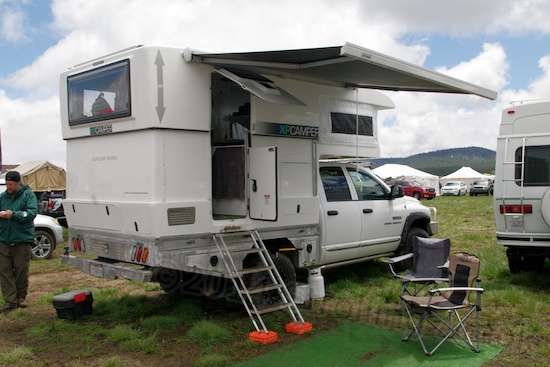 One model of XP Camper uses a hinged clamshell to allow a pop-up's air drag and CG advantages with the protection and insulation of a hardwall truck camper.