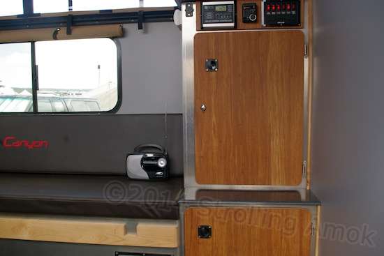A shot through the open window shows the hint of long bench seats and dining table. That whole area flattens into a massive sleeping surface. A kitchen of sorts and pantry are further up.