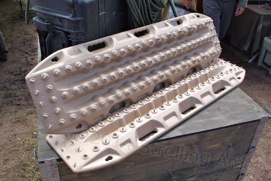 On the right is an alternative to plastic traction boards. This is sold specifically as a bridging ladder. The Furd would not be absolutely certain to bend these up too, since they are rated at 2,000 pounds per axle. That's a little under what the Furd weighs in front. For traction or sticking inside a deep rut to prevent bottoming out the diff, these might work, but they might not be flat when returned to storage. Crux is now developing a heavier-duty version.