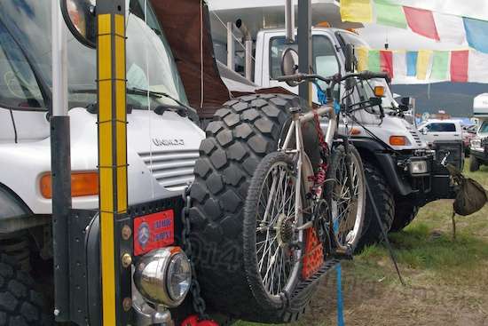 Back at camp, the Mighty Defiant is ready for some gnarly rock-crawling and stream-fording action, oh yeah. Well, at least the Aurora e-bike is. It’s just coated with mud from the show, hubs and all!