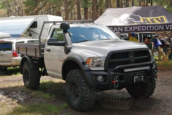 In this case, I had to smile. Image is everything. But I really liked it. That's an aluminum flatbed with removable sides. Dodge Ram, looking good. It has the appearance of an almost-stock Ram with a bed delete and big tires, but trust me, there's a big wad of money tied up in this thing.
