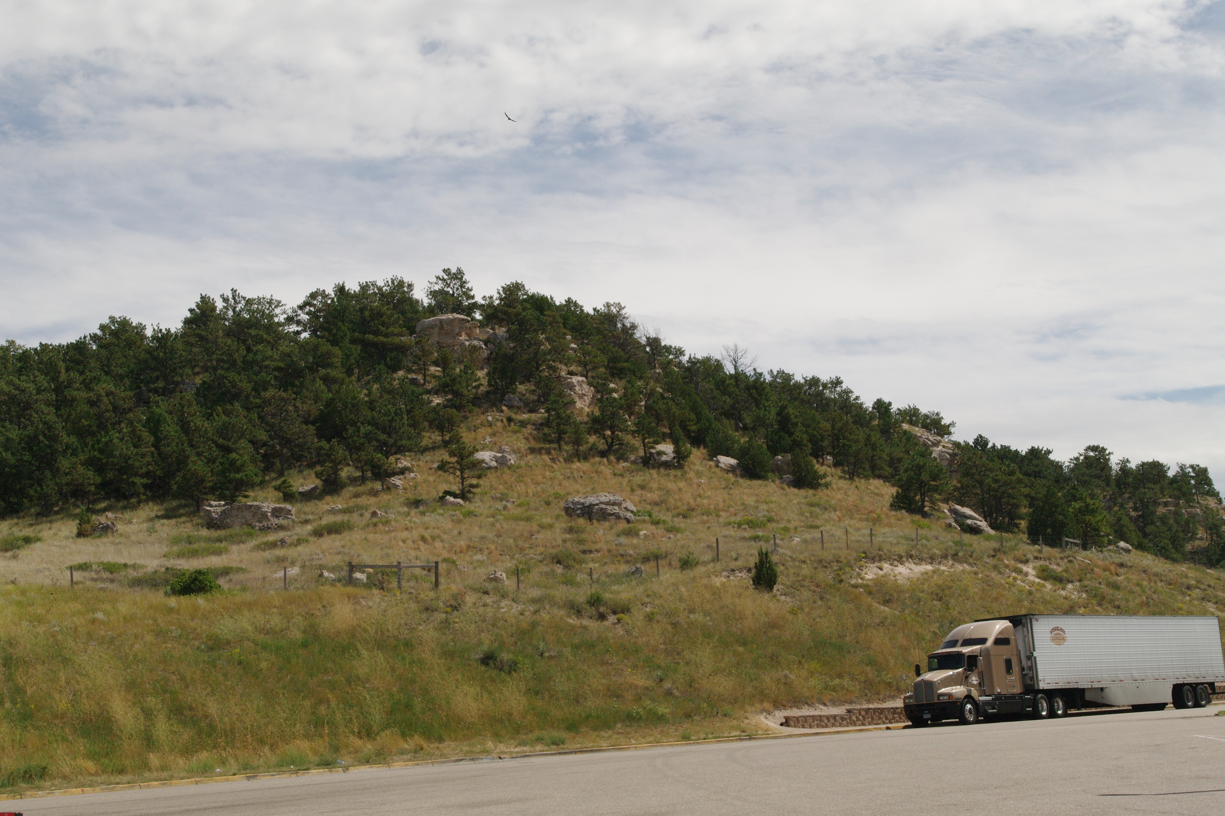 Just into the eastern border of Wyoming is a welcome center at about 5,100′ elevation, high enough to knock the cabin temps down to a balmy 83 degrees. There are only an official 6 truck spaces here, though more will probably pack around the perimeter. It has a slight slope to it, but nothing that the fridge can’t compensate for.