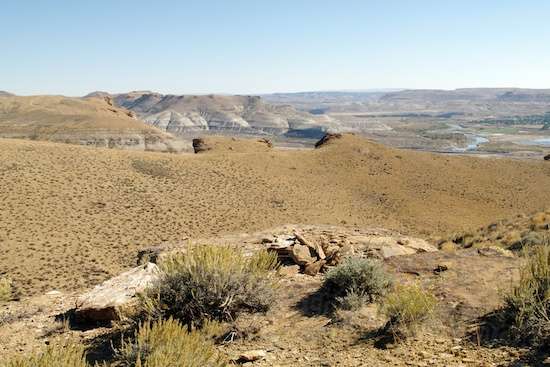 Approaching the edge of a hill and some boulders that would make for an interesting overnight with a sleeping bag and a campfire. The city of Green River below lights up like a vast Christmas tree at night, its light twinkling en mass.