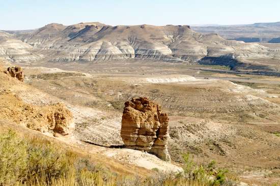 A nearby rock structure that resembles the stub of a petrified tree, its fiber snapped off and left ragged.