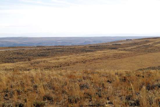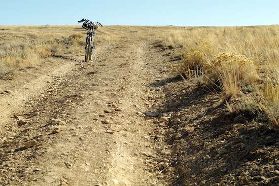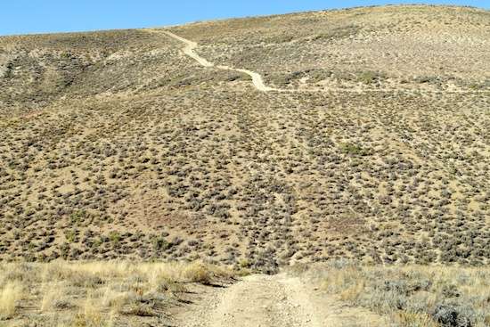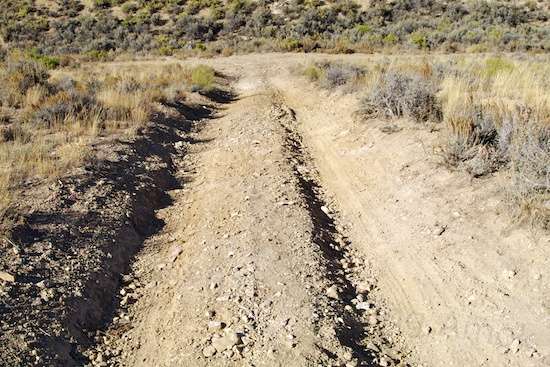 “Hey, that doesn’t look anything like I-80 down there!” The final drop that intersects the valley trail with a bang. The goal is to get as close to the bushes (on right) as possible, without letting that side tilt drop your tires down into the ruts. Need more ground clearance, stat! And maybe a tire pressure a lot lower than 75 PSI, eh?