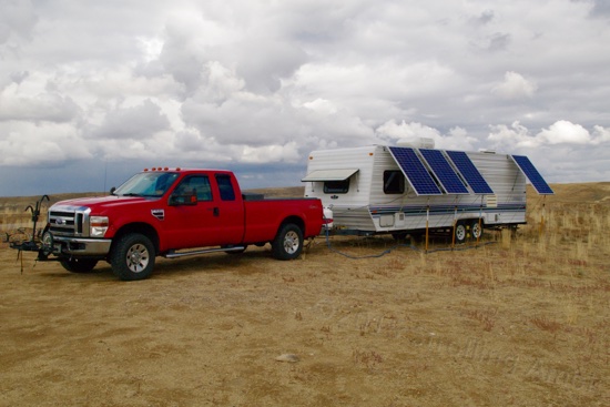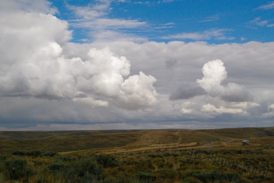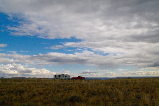 This post is simply about going no further than a quarter mile from camp, and taking a zillion snaps of my campsite. Ugh, sounds horribly boring, doesn’t it? See, I intended to go out for a walk day before yesterday, got out there a ways, and then noticed some rain heading my way. Couldn’t be sure of the timing though, because here above Green River, Wyoming, you can clearly see stuff that might be twenty or more miles away. So, I walked this way and that about the camp in order to stay within a reasonable distance of it.