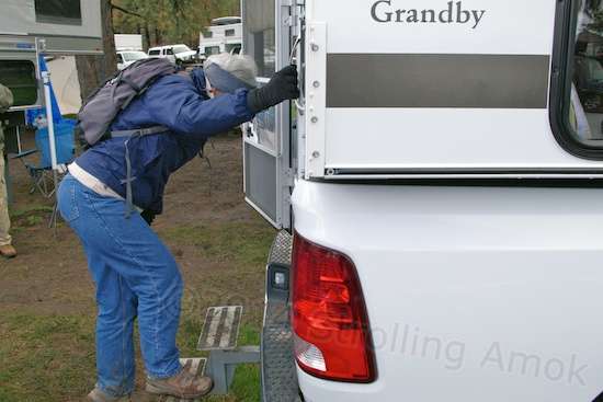 Lastly (for this post) is that “indoor-oriented person” issue. In a compact pop-up, the trick here is to maximize both usable storage and functional features within its ridiculously small space. Outdoorsy people do this by doing everything needed outside, with camping equipment. This works for them, and it’s cheap. After all, the camper does little more than serve as a sleeping and storage space, with occasional duty as a hidey-hole in bad weather. When the time comes to move, then the stove, propane canister, wash tubs and water jugs, storage bins, and all camping accouterments are stuffed back inside the camper, never to be opened until it all comes spilling out at the next campsite.