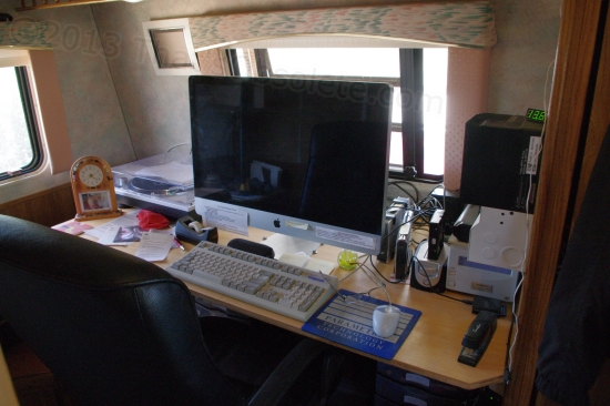 As for the Granby, apart from sitting crossways along a bench seat with a laptop, the dinette table is about it for a workstation. It’s a far cry from the Defiant’s full studio conversion. But it should work, if I can get my feet up for periods. The laptop will also have to do double duty as the movie player, since jamming the Defiant’s 28″ flatscreen TV in there is not going to work – unless maybe it can do double duty as the dinette table top! An inside shower is actually an option for the Granby, but I did not include it on my order. It’s very clever, but out of my financial grasp and I’m not sure I’d want to live with it long-term. So in those times that I don’t have access to some camp or public coin-op shower, all the world shall revel in my glory.