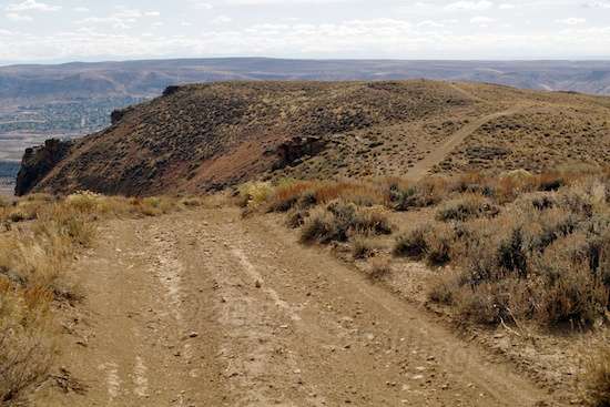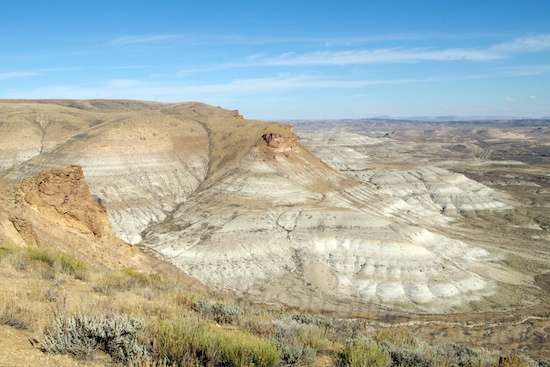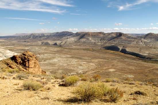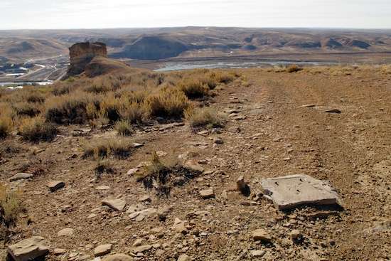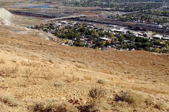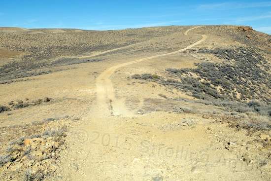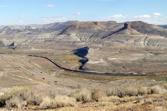Top of the world! I-80 and dual railroad tracks lead to Green River, on the right. Too distant to hear, those tracks are the busiest I’ve ever seen. The surrounding terrain makes all the activity seem very limited.