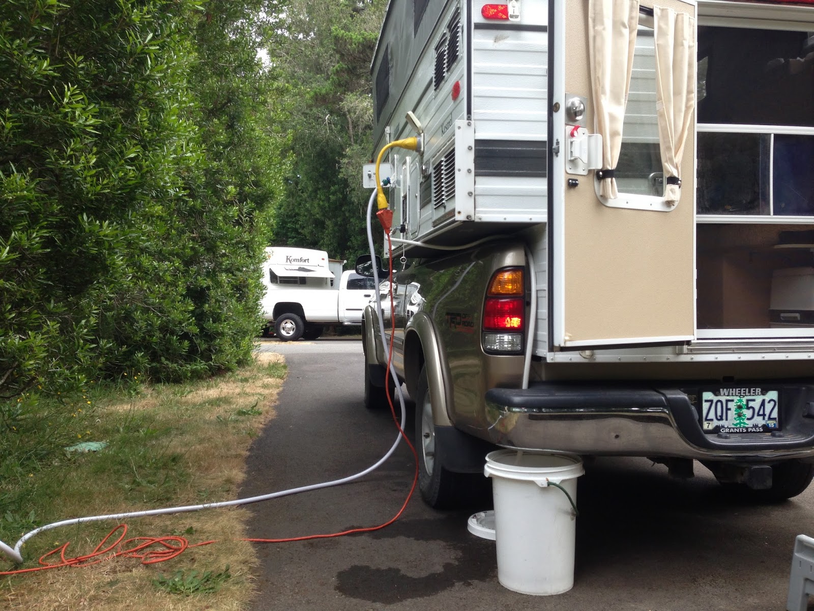 In a regular RV park with hookups, you can the Four Wheel's freshwater inlet and shore power socket. The white hose at the rear is connected to the greywater outlet, and here leads to a bucket, as used in the field. A longer hose would allow for a sewer connection.