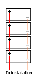 Here’s the simplest way, above. The lower you go in the diagram, the more amperage is pulled from each battery in turn. That wears out the bottom battery first, and when it goes, they must all go with it.