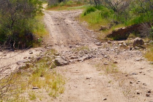 As I’m standing in the wash, camp is toward the left. Not a big challenge, though I’d still take it slowly and listen for ground contact at the rear overhang. The trick with these is that the slope on the right can lift the front end of the truck more than you expect, and ground out the cargo box as soon as the rear wheels drop that little bit into the wash. The effect would be more-so on the return trip from right to left.