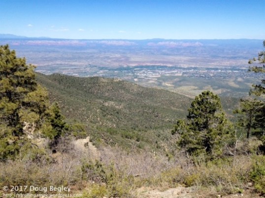Once back at Mingus Mountain, I found the road to the park campground to be open, and I stopped at a sightseeing vista point. I suspect that the town in the distance might be Cottonwood, but I didn’t think to look at a compass to find out. At any rate, it’s waaaay down there.