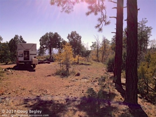 A forecast heatwave moving into Cottonwood, Arizona made me chicken out and climb back to the cooler air of Mingus Mountain yesterday, something like 6.5 miles away, but 16 on the road.  Cooler, but probably not cool. Mingus is more problematic to get accurate temperature forecasts about, so you get what you get. This time, the trip was all climb, so the Mighty Furd burbled its way up the serpentine that is 89A. I’m not the only one who deserted Cottonwood’s 3,500′ elevation, which is expected to hit 90 degrees today and head for the mid-90s until Sunday. My location at 7,300′ should knock that down by perhaps 10 degrees. Of necessity, I’m not conforming to my pre-planned travel itinerary, but the time prior to the Overland Expo consists mainly of mucking about at various unfamiliar sites onroute, their elevations being unknown but certainly not as high as Mingus, so forget it.