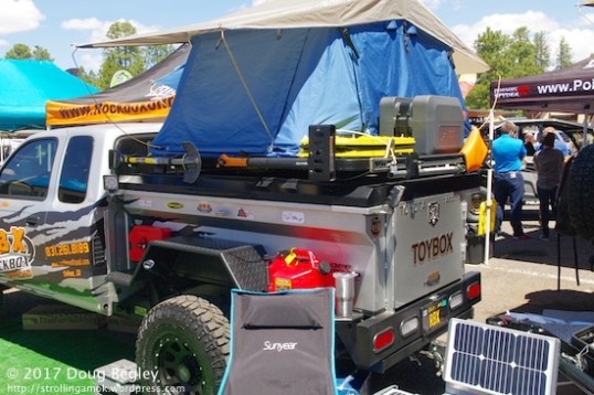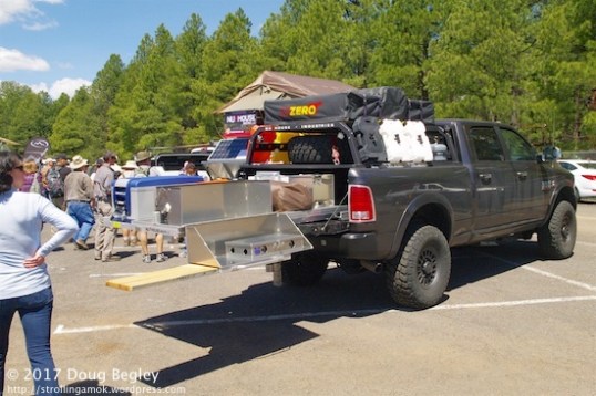 This guy had really thought out how to use a truck bed for storage. The big problem for using pickups and SUVs for camping is having to tunnel in to the front for the one thing you need. This truck had a hard tonneau cover fitted, which held up the spare tire, then a rack over that. The bed cavity is taken up solely by long drawers that hold everything needed for cooking, food prep, storage and clean-up. Deals like this, whether in pickup beds or specialty “adventure” trailers, drew significant interest from de weemens, since when they take ownership over vittles, they want workable order, not chaos and a messy, makeshift jumble to deal with after the meal. Unless they’re camping minimalists, they do not want the family outing to be more of a PITA ordeal than a pleasure. The chef, male or female, deserves to enjoy the outing, too. Imagine all this equipment just tossed loose into the bed.