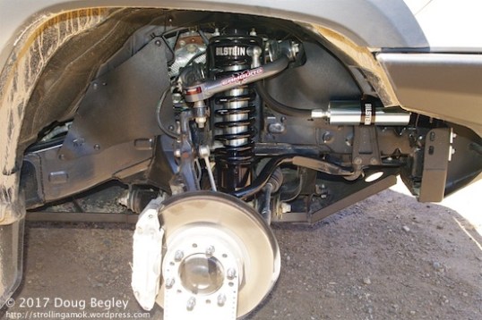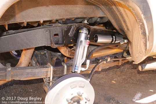 Raising the solid-axle leaf spring rear is a lot more straightforward. I’m not convinced that a racing-level shock is what most off-roaders need, but they’re a flagship product. I hate to think what a flapping burst tire carcass could do to this setup.
