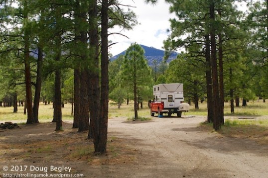 The above is a shot taken at 8AM, temperature about 38 degrees. Welcome to Flagstaff in late May. It was a cold one last night, with the temperature 30 degrees at 10 PM. That’s right when the furnace ran out of propane, so I got shoes on and stepped outside to swap the Grandby’s twin 10# tanks. The 2″ of snow on the ground was a surprise, as was the 26-degree low for the night at 4 AM. I had the fabric-area window covers and extra-layer Arctic Pack buttoned up to slightly slow the cascade of cold air from the fabric. It worked pretty well, what with the furnace set to 58 and the batteries reasonably happy to power it for a lot of On Time.  (You can subtract about 10 degrees on the bed platform.) Today is forecast to reach a high of 60, and a low of 30. I’m at a little higher elevation than Flagstaff, so I might be a couple of degrees colder than that. Warmer air should be moving in tomorrow. That’s good, as a tank of propane that lasts me a couple of weeks at “normal” temperatures cuts down to 3-4 days in this kind of weather. Tomorrow is resupply day, just to avoid any chance of draining the “spare” tank before Monday noon.