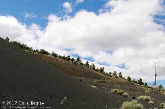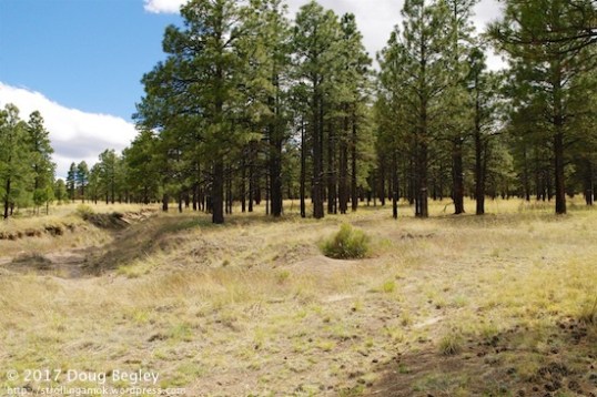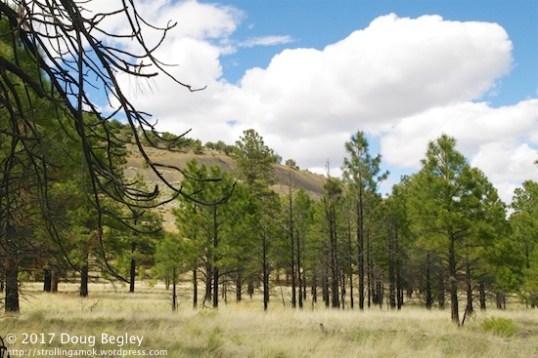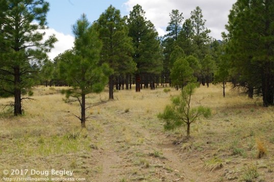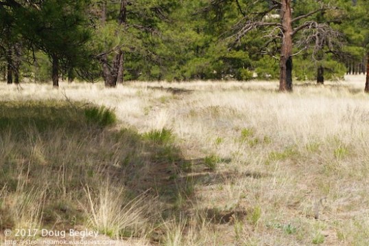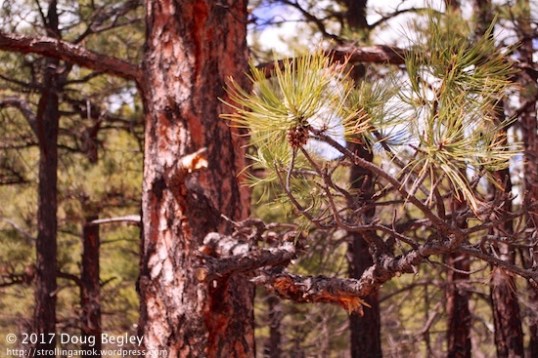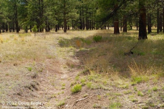 Yesterday, I went on a stroll down a marked trail that’s not on any map I have. FS9123G. Since it’s not on my MVUM map, it’s not for motor travel. It was once, but is doing its best to recover now. Like a similar trail I walked on Mingus Mountain, there’s something about the changing surfaces of these that makes them alluring. This one seems like it’s been many years since a vehicle has traversed it. Trails like these disappear in spots here and there, along the way. This one was a half-mile connector, cutting short an elbow in roads going toward a hill made of cinders. It’s longer trails like this that beckon me to explore them in the Mighty Furd, precisely since no one has been down them in a very long time. Why are they here? Where do they lead to? But these days, taking non-approved trails in a motor vehicle is just as illegal as cutting across pristine turf. No can do. Anyway, take a look at the snaps below.