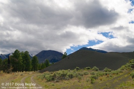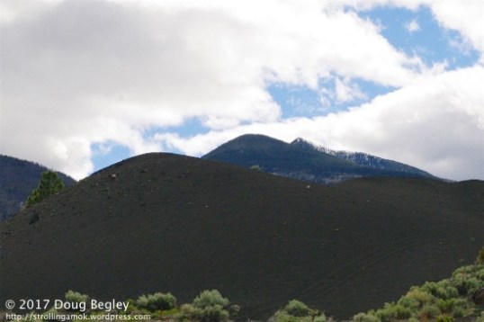 Similar shot, close-up. Cinder hill in front, a taller hill/mountain far behind it, and the ridge of a snow-capped mountain miles behind that. Since my vantage point is low, each crest is notably higher than the next.