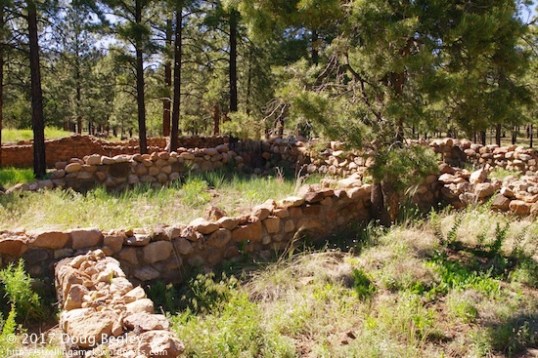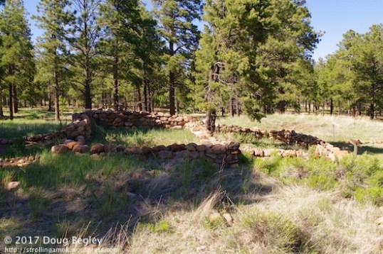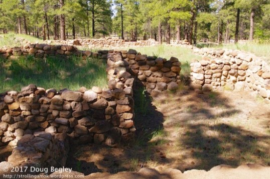 Few Native Americans lived in the Flagstaff area after that, so when the honkies moved in – er, I mean the Euro-Americans – in the 1870s, they pretty much had it to themselves. The assigned Elden name comes from a sheepherder after whom Mt. Elden is named as well. The pueblos were not discovered until 1916, when Mary-Russel Ferrell Colton stumbled over it while horseback riding. She and her husband, Harold, founded the Museum of Northern Arizona and began an archeological survey of the entire area. The find interested two men from the Smithsonian, which prompted a dig in 1926 using a dozen men. They unearthed 35 rooms and 2,500 artifacts. A little more digging by someone from Northern Arizona University 1966-1968 took place, but by 1978, the U.S. Forest Service was thinking about trading the area off for other land. Testing indicated that the site was still “intact”(?) and worthy of preservation, so they kept it. In 1980, it was decided to allow the “public” in the form of school children (sounds like a political decision, doesn’t it?) to have access to the site, as well as the general public. There was an Arizona Historical Society cargo trailer parked there when I visited, along with two portable toilets marked “boys” & “girls”. It looked like there was a further excavation being done in a pit.