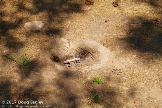 Various pits had various purposes. This one is a shallow dish. Afew pieces of burned wood are in it now, but that means nothing.
