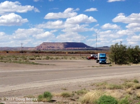 Day one brings the Bowlin’s Bluewater Outpost Travel Center. That’s along I-40, and I gotta say, the scenic views along I-40 in both eastern Arizona and western New Mexico, well, there’s just nothing like them. The red dirt in Arizona goes as far as the eye can see, and in New Mexico shifts to a light tan color. Flat-topped formations with a layer of boulders on top like icing, which spills down at the edges. It’s several hours of wow.