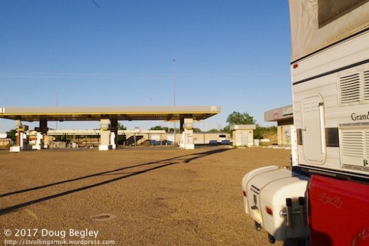 I’m overnighting in an abandoned Shell Travel Center in Tucumcari, New Mexico, and hoping I’ll have time to visit a local museum in the morning, before I journey eastward to a very nice city park in Meade, Kansas. This being the Memorial Day Weekend, my goal is to arrive late enough that most of the local campers will have cleared out by the time I get there. Experience has shown that this is not the best time to schedule in city parks and camping areas as part of a cross-country trip. Weekends make things tough enough, but holiday weekends multiply the availability problems. This place, with many buildings sprawling over several acres, has just one semi in it so far. Looks like nobody wants to camp out in a paved and deeply-potholed parking lot. To each his (or her) own.