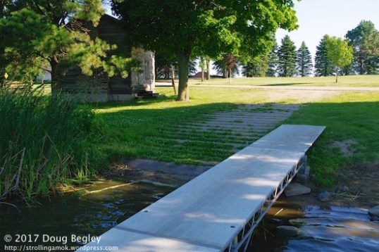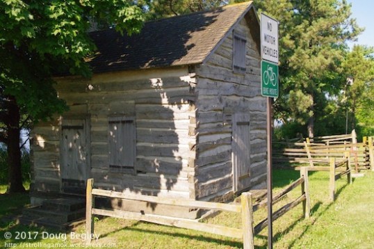 An early log cabin, restored by volunteers in 1988, is beside the first boat launch. A water pump and stock pen are to the right side.