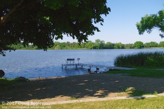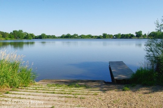This pier and boat launch is on the park-side of the lake. a sand “beach” has been added, with a tiny swimming area being roped off.