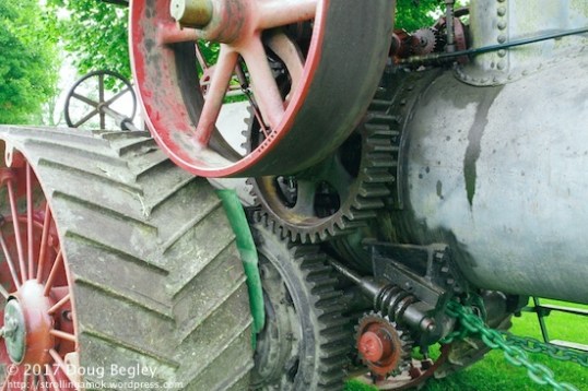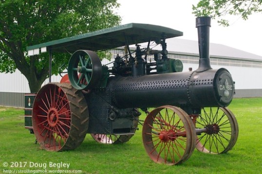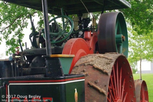 Different weeks here in Butterfield bring different sights. This week, it’s a couple of steam-powered threshing machines that have been moved out of a large shed and parked on the grass. This won’t do the grass much good in the long run, since the prodigious weight on the rear wheels of these things visibly compacts the soil! These two are not the largest I’ve seen, but they are certainly large enough.