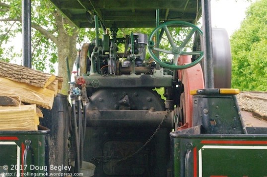 The back of the boiler, with levers and valves. I’m not sure about that small opening, since the larger door below opens to…nothing. This door seems to be a bit small for feeding wood, so the mystery continues. That “necker’s knob” on the steering wheel is necessary, since even though the steering ratio is slow for more leverage, that means that large maneuvers require a mad whirling of the wheel for quite awhile.