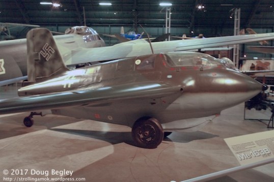 This Me-163B rocket-powered interceptor was a defensive airplane late in the war. Rocket powered for a 7.5 minute flight time, it could reach 600 MPH and climb at 18,000 feet/minute to reach a ceiling of almost 40,000 feet. Intended for use against Allied bombers, they were credited with 9 kills for a loss of 14 their own. Their fuel was extremely hazardous, killing several pilots in spontaneous explosions. Assembled with forced labor, this one had a stone wedged between the fuel tank and a mounting strap, as well as contaminated glue in one wing. Scrawled on an inner panel were “Factory closed” and “My heart is not occupied”, written in French. Considering the murder and starvation death rate of forced labor camps, being discovered as a saboteur “merely” risked speeding up the process by months.