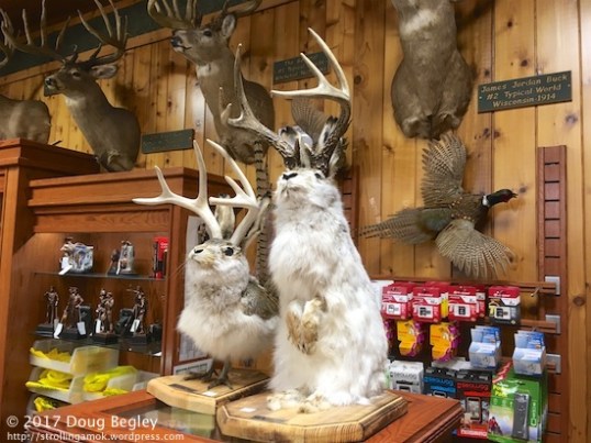 One can’t say they’ve really visited Wall Drug without seeing the Jackalope, can one? You can actually buy a stuffed one now for $250. The creature to the left is apparently a genetic variant, a blending of the Jackalope with a pheasant. It has a pheasant’s back, tail feathers, and legs. As explained to me by a clerk, this example was the accidental result of a Jackalope getting into the pheasant pen. The inference was that Jackalopes are either nearly blind, or not very selective in their mating habits. Amazingly, this offshoot was priced at just $200. I didn’t buy either of them, the mere vision being sufficient for me.