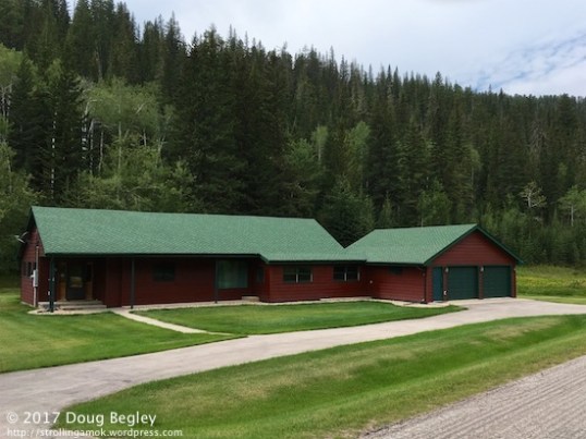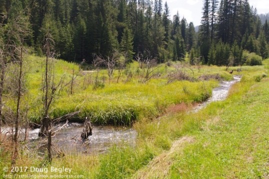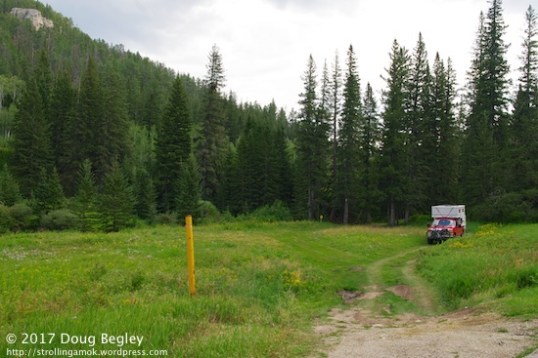 A smattering of vacation cabins along the way and, voila, the camping spot. It was a small loop in a small meadow, the entry of which was so tightly angled backwards that the Mighty Furd could not possibly make the 160º turn without plunging deep into the high weeds. A pull-off some distance further down allowed the necessary three-point turn, and down into the meadow I went on my return. True to the published description, Hanna Creek rippled loudly next to the meadow, so I took pains to park the required 100’ from it. I was also just short of a road sign declaring a restricted camping area, since Hanna Campground was a half mile further.