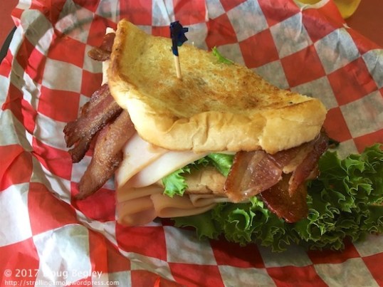 The sandwich arrived looking like some kind of Dagwood sandwich, with two formidable stacks of thin-sliced turkey, plenty of fresh lettuce, and an obscene amount of thick, perfectly cooked bacon dangling out. It turned out to be one of those sandwiches that, once you take the first bite, you begin inhaling it, growling if anyone approaches. They seem to have made the bread toast by lightly pan frying it, perhaps in the bacon grease, and oh my, it was all I could do to stop and scrape off for the moment that it took to take the snapshot below. I resented that moment, by the way. Oh, that was tasty. I’ve been around the track a few laps, and that was the best, most satisfying sandwich I’ve ever had anywhere. And one or other of the women often but unobtrusively checked to make sure I was pleased and not needing something else. I can relay a second opinion, too. Some guy came in with his basket for another hot dog, raving about how good it was. I’ve had very good dogs, but this sounded way, way different than the usual, “still hungry, need another”. Fortunately, these two seemed to have a steady flow of traffic while I was there mid-afternoon. The place was named Boondockers.