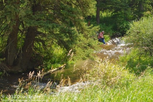 He had parked in the shade as close to the stream as he could possibly get. This dog, a nondescript, shaggy black mutt, was silent and showed some grey, and it ambled slowly about. When I emerged from the camper to reposition my ground panels more toward the sun, it toddled over at a pace that underscored the very concept of “leisure”, wagging its half of a tail and nuzzling in for a little appreciation like a long-lost friend. As long as I talked to it or petted it, it stayed around. When I turned away to move a wire, it figured “well, that’s it then, I’ve done my job here,” and sauntered back toward the van.