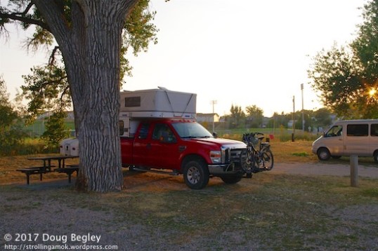 Wheatland has two exits off of the modest run of I-25 on my route, so it is apparently a notable town. I can guess that because it also apparently has a Safeway supermarket. Lewis Park is at the outskirts near some fairly busy railroad tracks, but if you’re tired enough you won’t wake at the train horns. Along with the usual sports fields, this park includes spots for both RVers and tenters. Free stays of up to 3 days are allowed, and since the weather won’t get hot here for another day, I’ll rest and go through another box of Kleenex for an extra day. I haven’t spotted a dumpster yet, but this place has potable water and a dump station. What more could one ask? One odd thing when I had arrived and set up camp was some guy in the driver’s seat of a newish Sprinter van parked a couple of spots away, jabbering loudly into his cellphone in some Eastern European dialect. That went on for quite awhile before he pulled away in the darkness. It was just unusual, not particularly distracting.