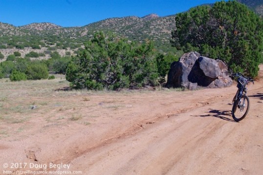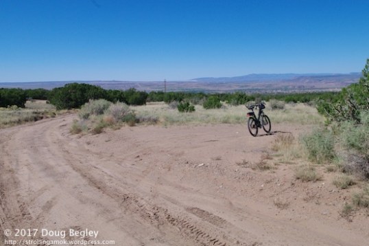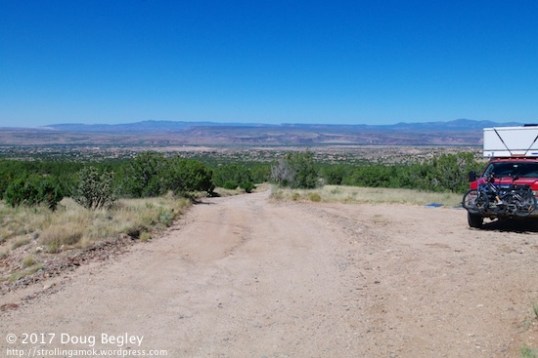 My campsite is the fourth one in on the east-most entrance to 445. Elevation: 5,937′, GPS: 35.287674, -106.476982. I use the word “campsite” loosely, since most are very compact pull-offs on the way around the 6-mile loop. Not a campfire ring or evidence of a charred spot anywhere. With many of the pull-offs being not particularly level, you may need to address your rig’s resulting tilt. My own wheel chocks can’t compensate fully, but what’s left is just fine with me. The campsite’s surface here is a smooth mix of dirt, pea gravel and sand. I’d expect mud to be a problem for tracking into the rig, but nothing like the nightmare silt where I overnighted previously. After scouting around on the e-bike, I can say that other sites vary considerably for levelness and surface composition. The third site I stopped at on the way in had one bar (of four) of Verizon signal. Number four, being higher up, has two bars. In trade for better Internet reception, my chosen site is closer to some high tension lines going through. Most sites are far from them.